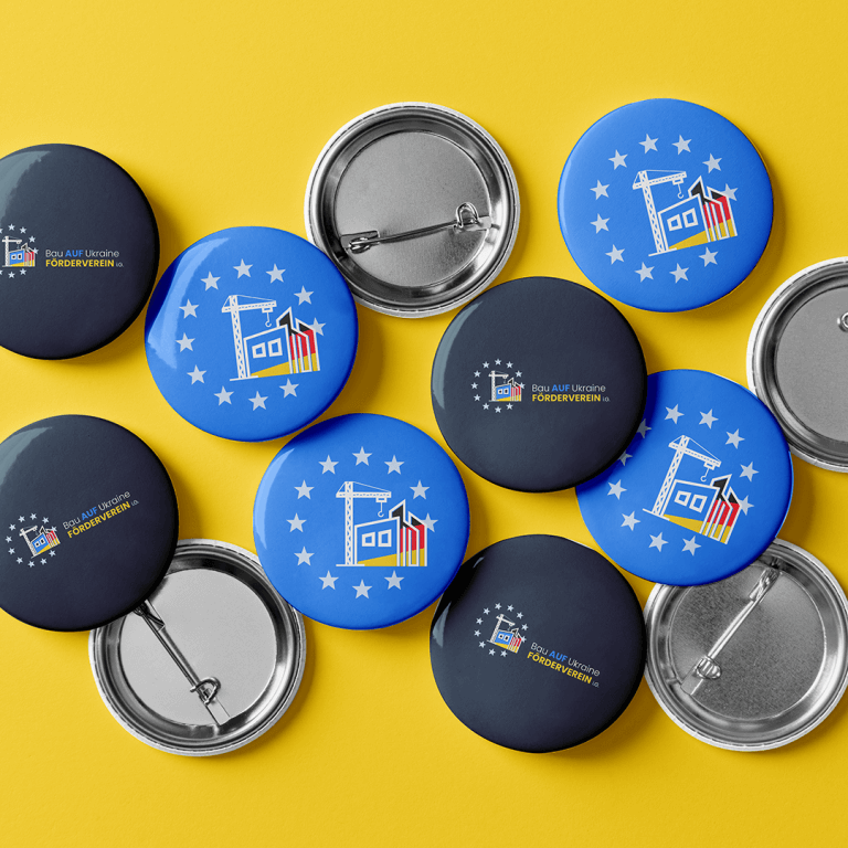Das Logo des Fördervereins „Bau AUF Ukraine“ vermittelt auf eindrucksvolle Weise die Mission des Unternehmens: den Wiederaufbau der Ukraine nach dem Krieg. Die Gestaltung verbindet symbolisch die Solidarität Deutschlands mit der Ukraine und die Vision einer gemeinsamen Zukunft. Durch die Kombination von starken grafischen Elementen, klaren Farben und einer ausdrucksstarken Typografie wird eine optimistische und entschlossene Botschaft transportiert.